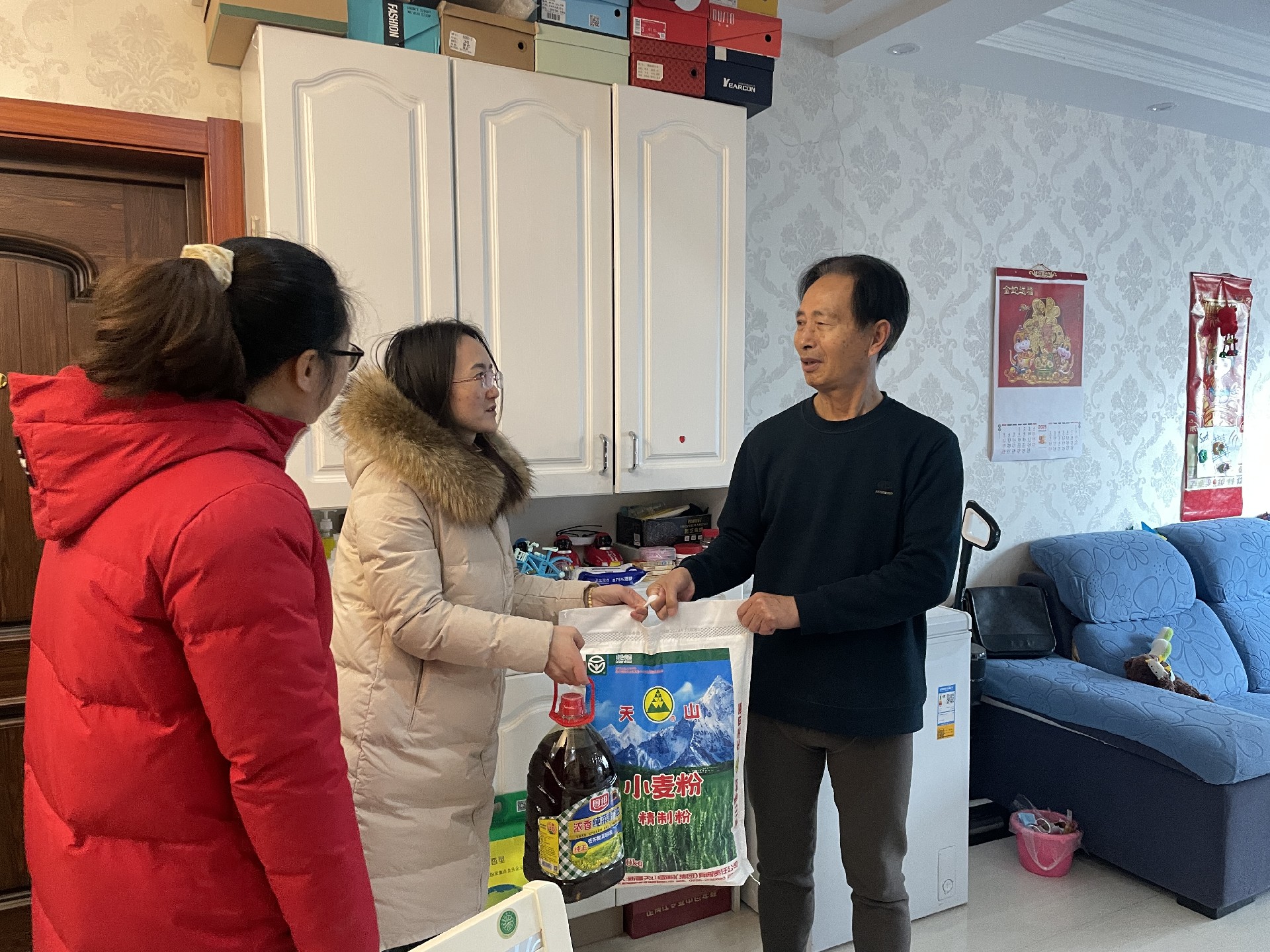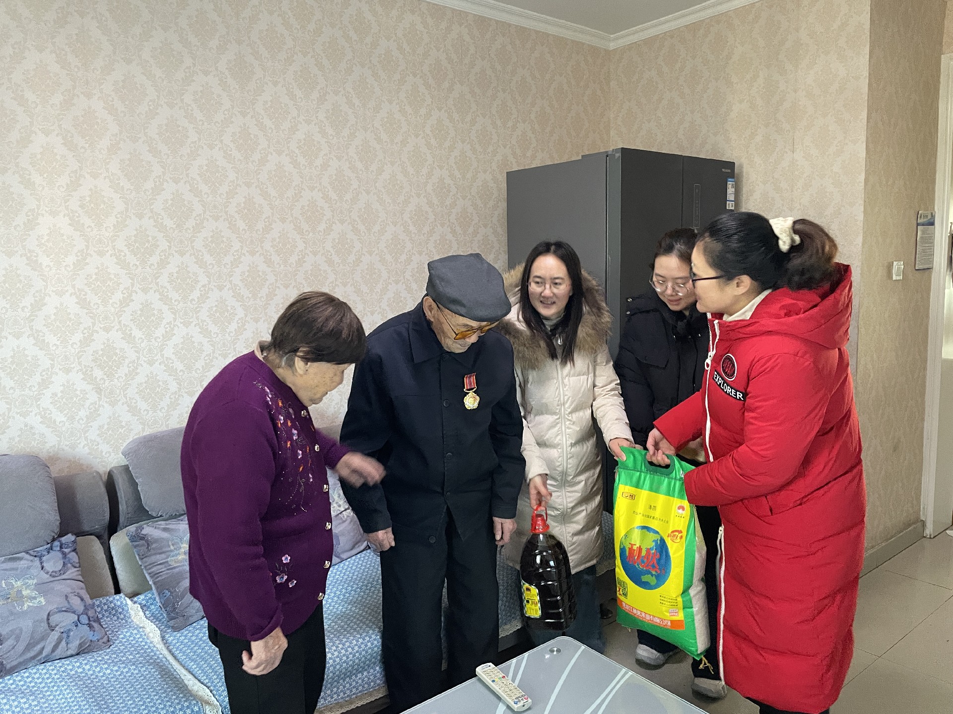 慰問現(xiàn)場(chǎng),楊長(zhǎng)福總經(jīng)理親自帶隊(duì),和社區(qū)工作人員將慰問品送到警務(wù)站一線民警手中,對(duì)他們長(zhǎng)期扎根一線,保護(hù)人民群眾生命財(cái)產(chǎn)安全表達(dá)了誠(chéng)摯的感謝。隨后,社區(qū)人員和公司代表一同將米面油等慰問物資,分別送到5位退伍軍人家里,并與他們交流生活近況,叮囑他們保重身體。