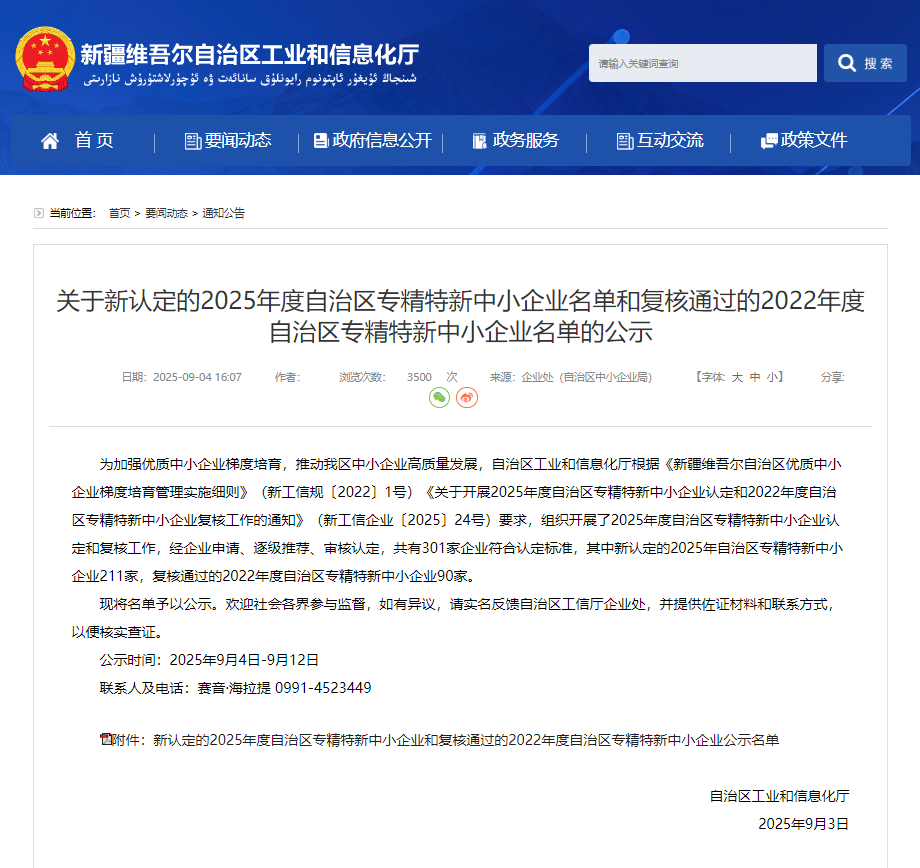 近日,新疆維吾爾自治區(qū)工業(yè)和信息化廳正式公布了2025年度自治區(qū)專精特新中小企業(yè)新認(rèn)定名單。新疆華遠(yuǎn)同創(chuàng)科技有限公司憑借專業(yè)的技術(shù)實(shí)力、精細(xì)的服務(wù)態(tài)度和創(chuàng)新的發(fā)展理念,成功通過“2025年度自治區(qū)專精特新中小企業(yè)”資質(zhì)認(rèn)定。